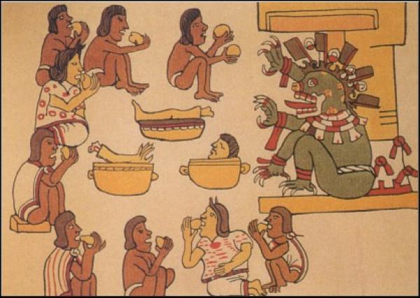 2- Antropofagia: Pues así es, amiguitos, siendo unos avanzados a su tiempo, y unos visionarios, los aztecas practicaron ese bonito rito de tomar y comer el cuerpo y tomar y beber la sangre de la gente, lo que pasa es que lo hacían al pie de la letra. Las clases gobernantes aztecas, se morían por un chuletón humano de cuando en cuando, y según relata Días del Castillo, prácticamente todas las aldeas, pueblos y ciudades aztecas, tenían jaulas en las que hombres y mujeres eran cebados para ser sacrificados luego, y enviados al mercado, donde su carne era muy apreciada. Como el que lleva una botella de vino a casa del jefe cuando este le invita a cenar, los aztecas utilizaban la carne humana como ofrendan a alguien a quien quisieran agradar, y si encima era de un enemigo derrotado, mejor que mejor, como un buen Ribera del Duero, vaya. Tras los sacrificios, las víctimas eran desmembradas, y los muslos (la parte fetén, según parece) era enviada al palacio real, mientras que el resto se repartía entre los asistentes y público en general. Según muchas fuentes (ojo a la justificación), los nativos mesoamericanos, tenían una dieta muy baja en proteínas, y la falta de grandes animales domésticos hacía muy difícil para ellos consumirlas. Con la llegada de los españoles, claro, se terminó el chollo de comerse a los demás, y los jamones y chuletones de esclavo fueron sustituidos por cerdo, cordero, ternera, etc. Claramente, otra muestra de genocidio.